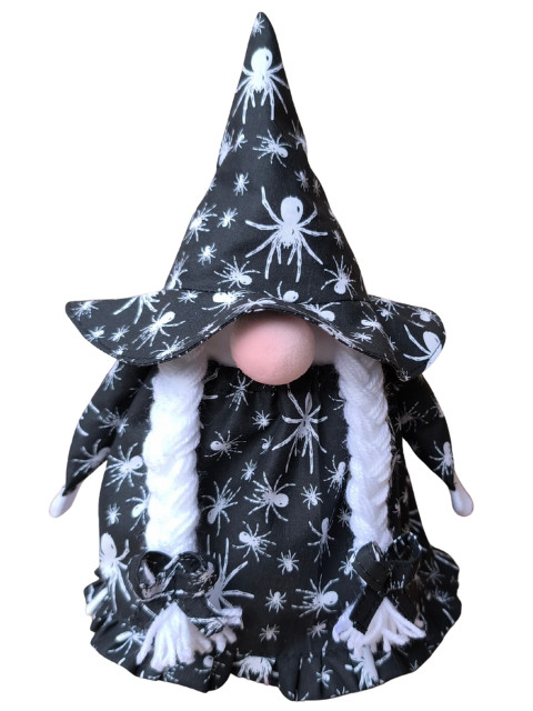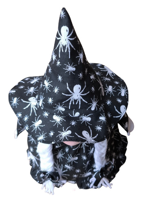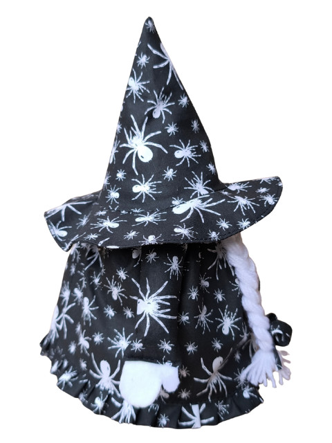 A manó fekete alapon fehér pókos szoknyába, fodorral az alján,  és ugyanilyen mintás boszorkány sapkába öltözött.