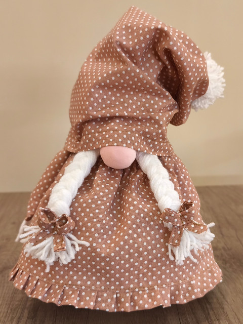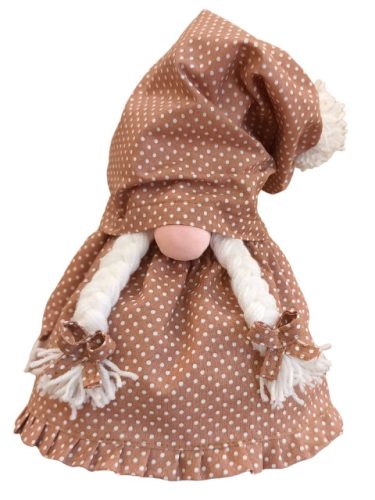 A manó barna pöttyös mintás szoknyában és barna pöttyös sapkába öltözött. A barna pöttyös cipője tökéletesen kiegészíti az ünnepi öltözetet, és stílusos megjelenést kölcsönöz.
