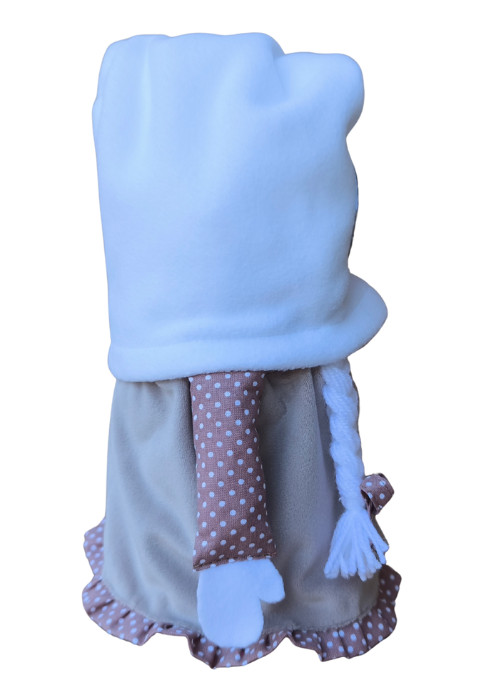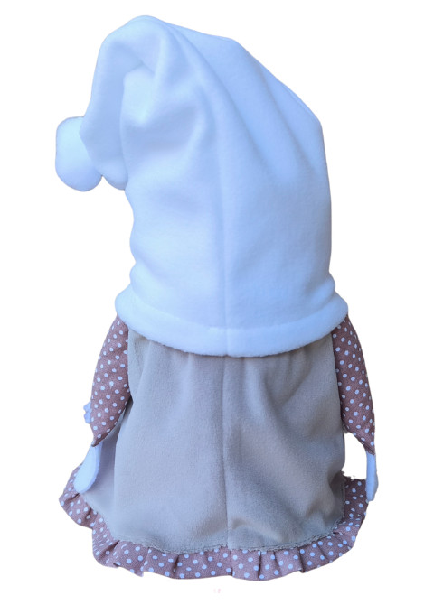 A manó barna szoknyában pöttyös mintás fodorral az alján, és fehér polár sapkába öltözött. A fehér cipője tökéletesen kiegészíti az ünnepi öltözetet, és stílusos megjelenést kölcsönöz. A polár sapka elején lévő kávé mintás felvarrott anyag mintája nem mindegyiknél ugyanez, de a kávézással kapcsolatos mindegyik.