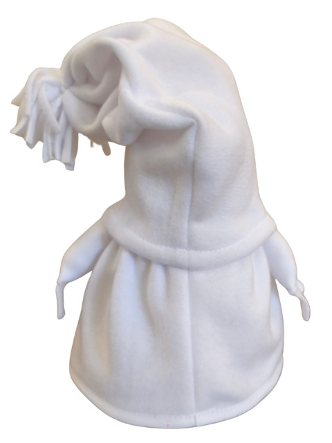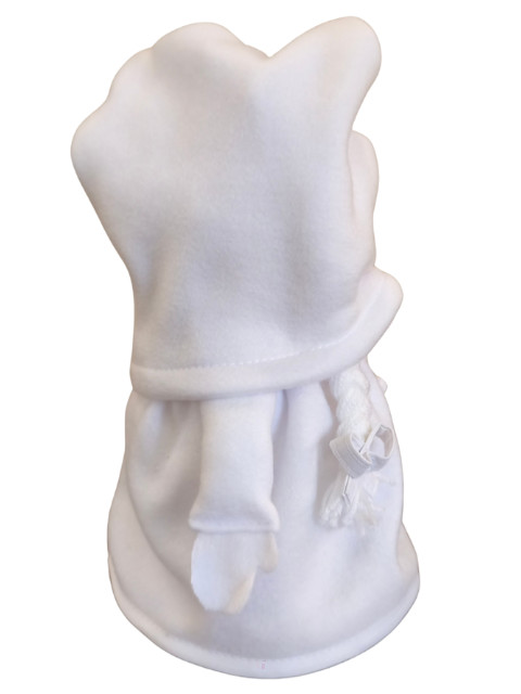 Szoknyája és sapkája fehér polár anyagból készült, amely a tél tisztaságát és a minimalista, egyszerű stílust idézi.