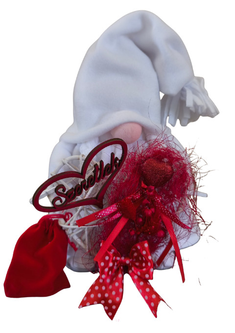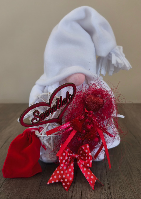 A piros szín dominanciája a szerelem, szenvedély és összetartozás jelképe, így ez a manó tökéletes dekoráció vagy ajándék Valentin-napra.