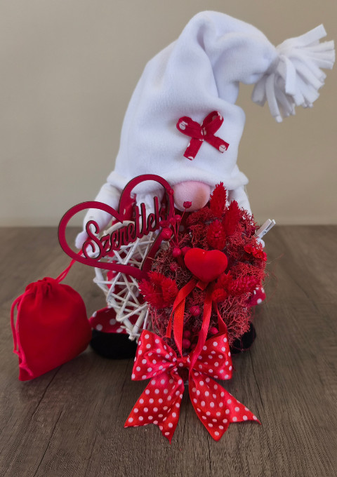 A piros szín dominanciája a szerelem, szenvedély és összetartozás jelképe, így ez a manó tökéletes dekoráció vagy ajándék Valentin-napra.