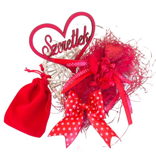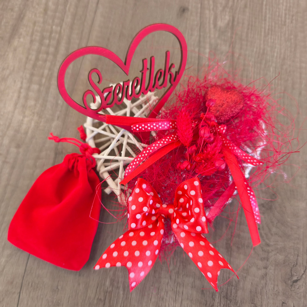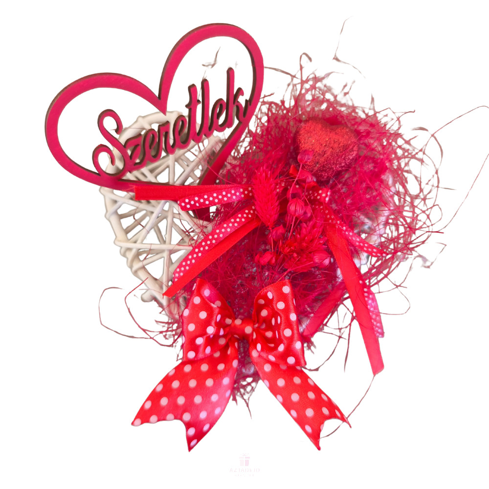 15 cm-es fehér vesszőszív masszív fém vázra épül, amely biztosítja a tartósságot és a stabil formát. A szív egyik oldala gazdagon díszített, ahol a piros szín dominál: gondosan válogatott szárított növények, természetes textúrák és romantikus részletek alkotnak harmonikus egységet. A díszítés sűrű elrendezése mélységet és különleges megjelenést ad, miközben megőrzi a kézműves jelleg egyediségét.