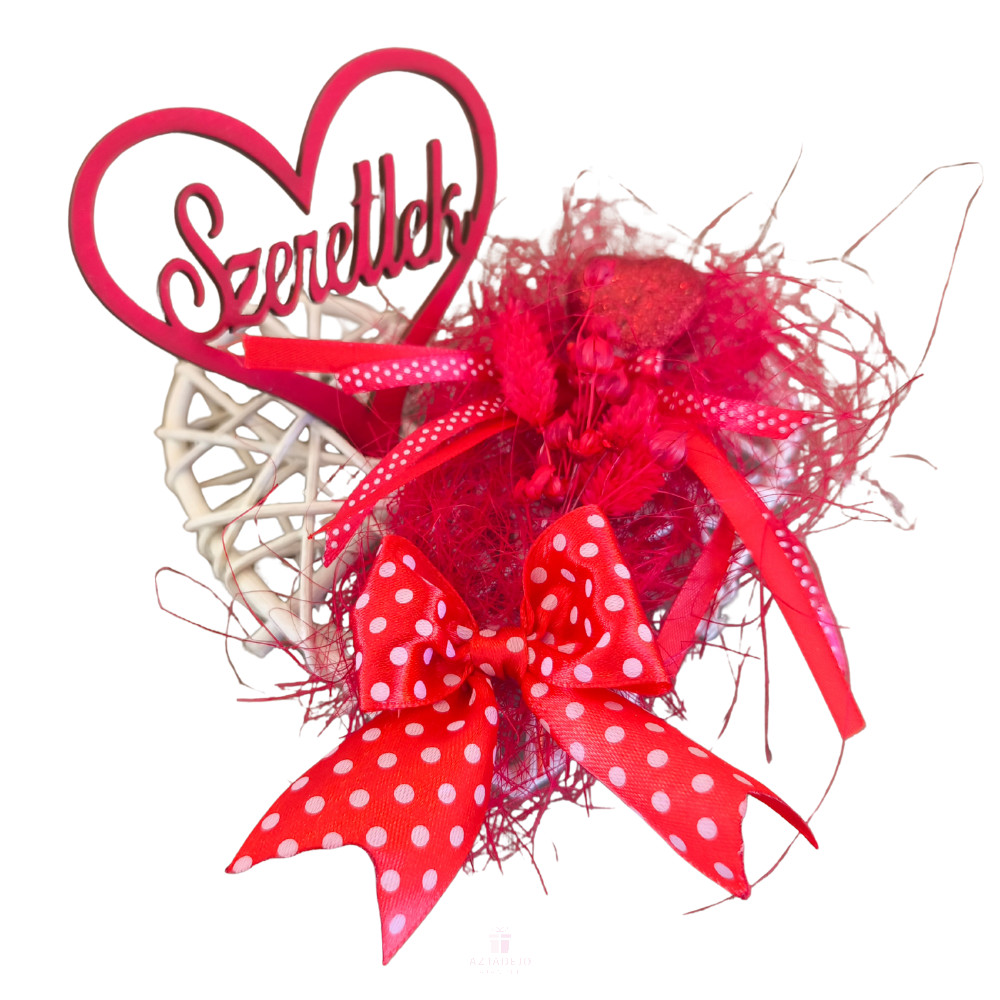 A kompozíciót egy saját készítésű, piros pöttyös masni zárja a szív alján, amely játékos, mégis elegáns hangsúlyt ad az összhatásnak.