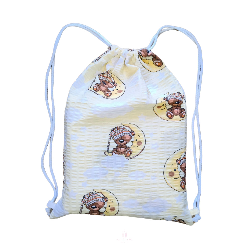 Az Aztadejó macis krepp anyagból készült tornaszsákot azoknak a gyerkőcöknek ajánljuk, akik szeretik a macikat. Halvány sárga alapon fehér felhők, holdon ülő macikkal.