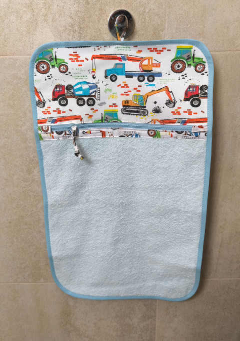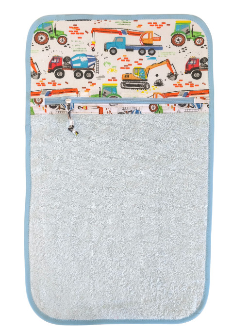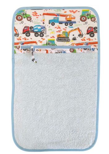 A kéztörlő világoskék frottír alapja és kékes tónusú, autós mintás pamutvászon zsebe kifejezetten a kisfiúk kedvelt szín- és mintavilágát idézi. Az autós motívum a gyerekek körében időtálló és népszerű választás, játékos, mégis letisztult megjelenést kölcsönöz a törölközőnek.