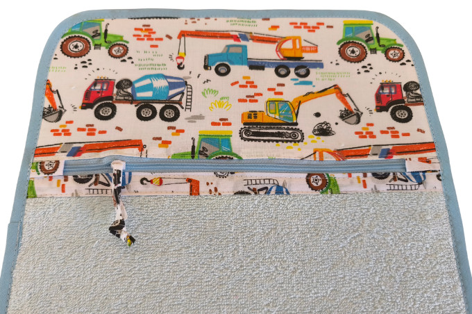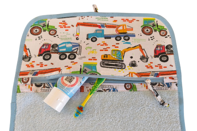A felső részen egy kb. 15 cm magas, színben harmonizáló 100% pamutvászonból készült cipzáras zseb kapott helyet, amely praktikus tárolóként szolgál. Ide könnyedén elfér egy fogkefe, fogkrém, fésű vagy más apró higiéniai eszköz, így különösen hasznos utazáskor vagy közösségbe járó gyerekek számára.