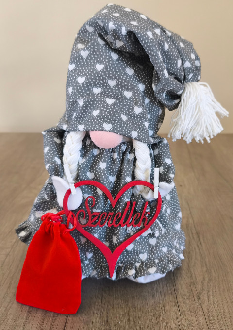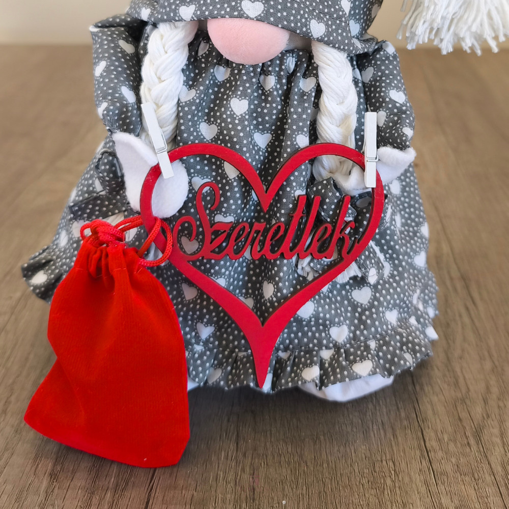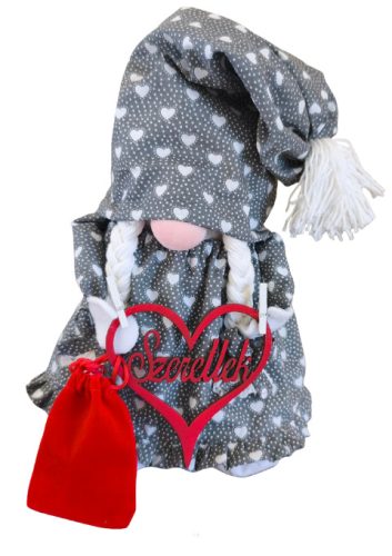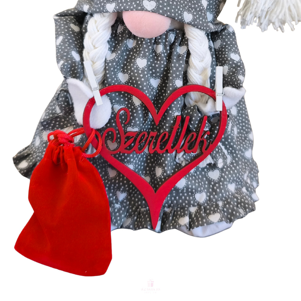 Aztadejó Valentin-napi manó szürke fehér szivecskés szoknyában – „Szeretlek” szívvel