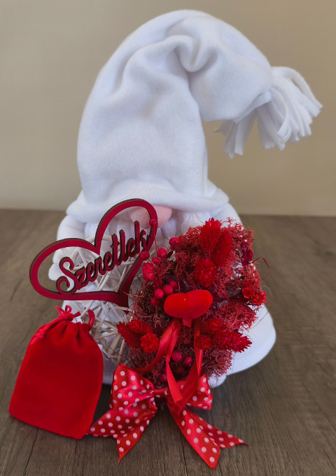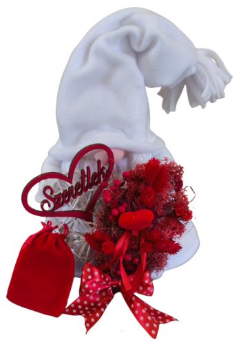 A piros szín dominanciája a szerelem, szenvedély és összetartozás jelképe, így ez a manó tökéletes dekoráció vagy ajándék Valentin-napra.